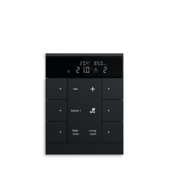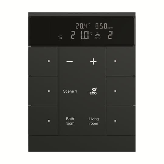 Fritt konfigurerbara multifunktions kontrollelement med RTC, CO2 samt luftfuktighetsgivare. Integrerad KNX-buss kopplare. Med märknings fält. Stöd för KNX-funktioner genom innovativt färg koncept (gult = belysning, blått = blind, orange = RTC, magenta = scen och vit = neutral/ingen funktion tilldelad) eller standardbelysning röd/grön.