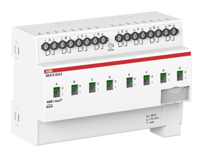 Aktorn använder potentiella fria kontakter för att växla 8 oberoende elektriska belastningar via ABB i-bus® KNX. Varje utgång har en oberoende belastningsdetektering. Enheten har en manuell manövrering och visning av kopplingstillståndet för utgångarna. 16A AC3 (C-last) är särskilt lämpad för belastningar med höga startströmmar, t.ex. lysrörbelysning (AX) enligt EN 60669. Omfattande programmerbara funktioner.
