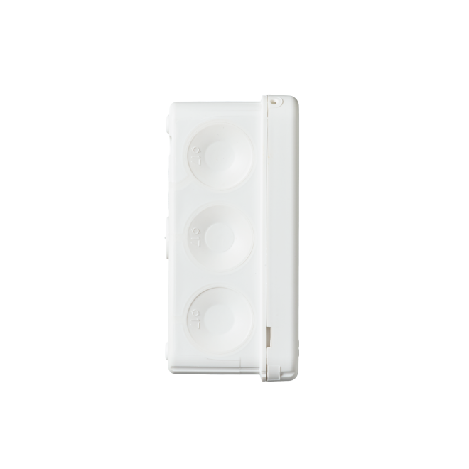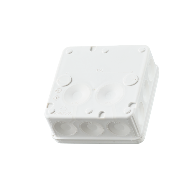 Den kvadratiska anslutningsboxen AP9 (2,5 mm², 500V) är utrustad med 10 membrankabelanslutningar för kablar upp till Ø 17 mm i sidorna, och två i botten för kablar upp till Ø 19 mm. Kablarna är lätta att ansluta genom att helt enkelt trycka in de avfasade ändarna genom inloppen. Dosan stängs med ett tryck på varje hörn på locket (snap-on). Vid behov öppnas locket genom att lätt vrida med en skruvmejsel under kanten. Lådan kan förses med dragavlastningar AS9.10, AS9, AS9.1 och AS9.3, som passar för Ø 6 - 15,5 mm kabel. VDE-godkänd. Monteringstemperatur -25 ... + 60° C. Tillverkad av halogenfritt och UV-stabiliserat material (IEC/61249-2-21)