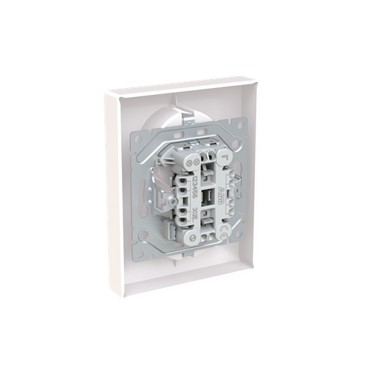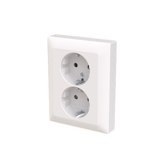 2-vägs vägguttag SAGA, infällt med plintar för varje kontakt på uttaget för max fyra stela ledningar. Inga X-terminaler. Beröringsskyddad uttagsinsats utan täckplåt. Biocirkulär plast används i centrumplattan.