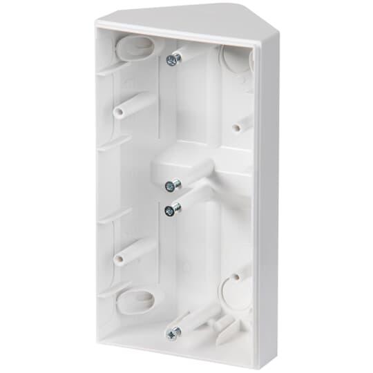 Hörnbox för ytmontage. För 2 Impressivo produkter för infällt montage. Används med 85 mm 2-facks täckram. I hörn-boxen kan man montera insatser som är 36mm djupa eller lägre