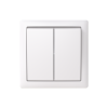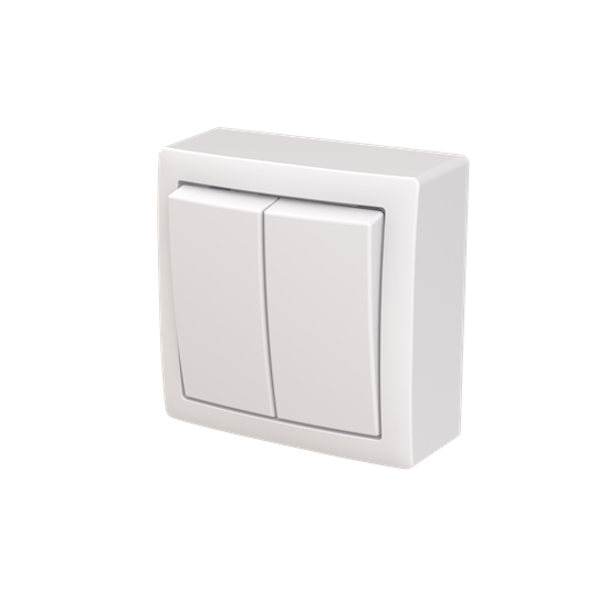 Strömbrytare dubbeltrapp SAGA för utanpåliggande montering med snabbplintar. Terminalerna är för max två solida eller stela ledningar. Inklusive brytarinsats, vippa, ytmonteringsram och botten. Biocirkulär plast används i botten- och mittplattan
