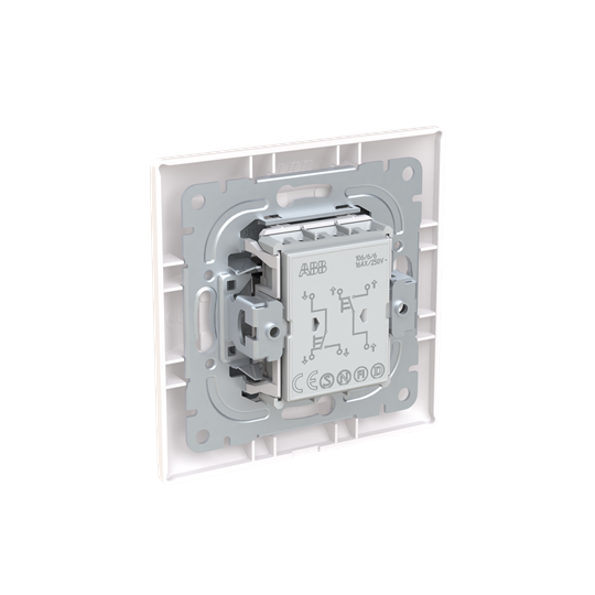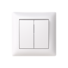 Strömställare SAGA med dubbeltrappfunktion, med snabbanslutning. Terminalerna är för max två stela ledningar. Komplett, inklusive täckram, brytarinsats och vippa. Biocirkulär plast används i ramen.