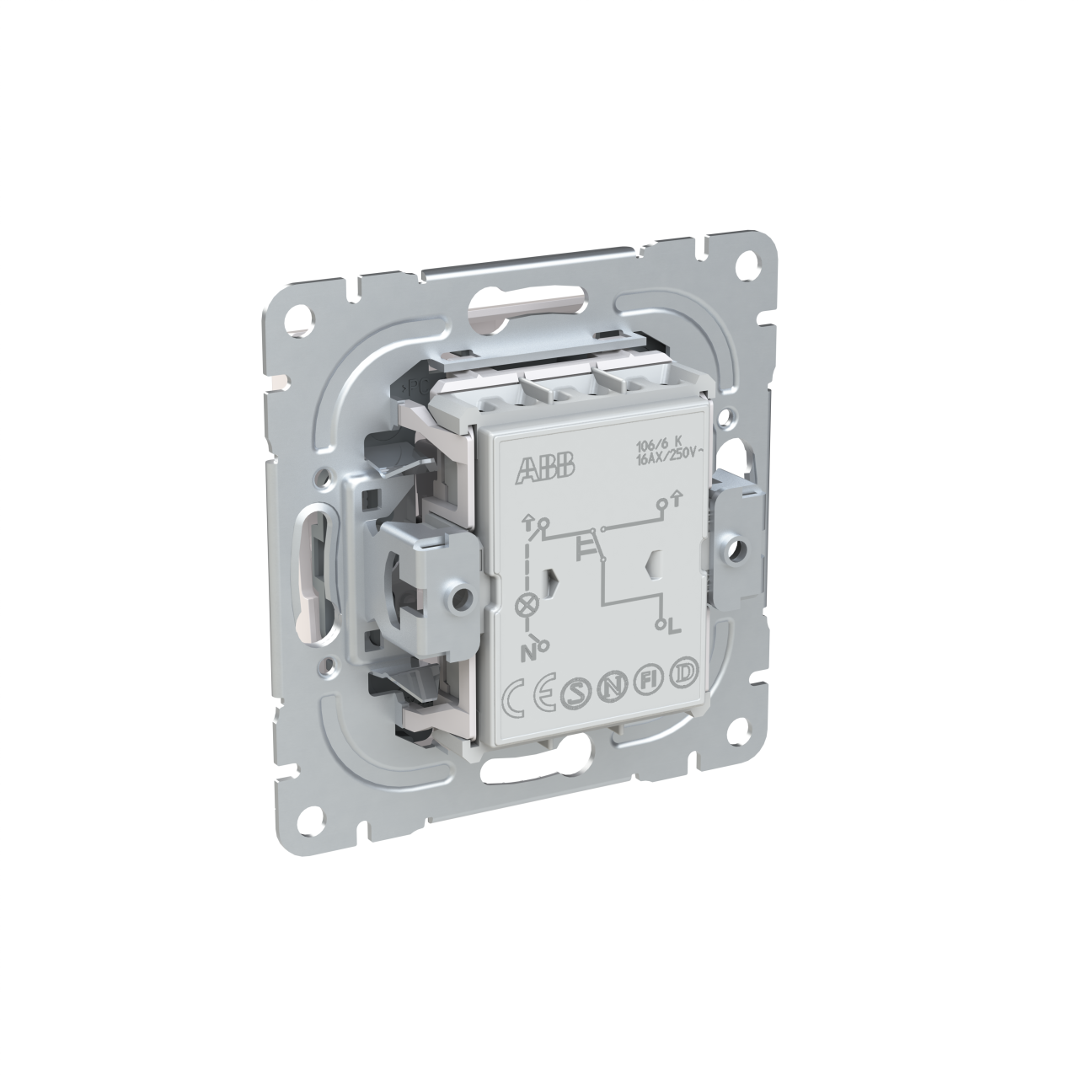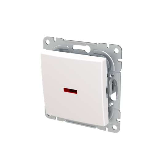 Strömställare SAGA med trappfunktion, med snabbanslutning och vippa med clip-on-fäste. Terminalerna är för max två stela ledningar. Röd signallampa ingår.