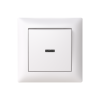 Tryckknapp SAGA med trappfunktion, med snabbanslutning. Terminalerna är för max två stela ledningar. Komplett, inklusive täckram, transparent lins, brytarinsats och vippa. Biocirkulär plast används i ramen.