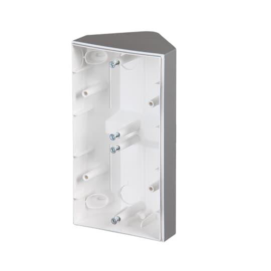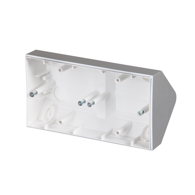 Hörnbox för ytmontage. För 2 Impressivo produkter för infällt montage. Används med 85 mm 2-facks täckram. I hörn-boxen kan man montera insatser som är 36mm djupa eller lägre