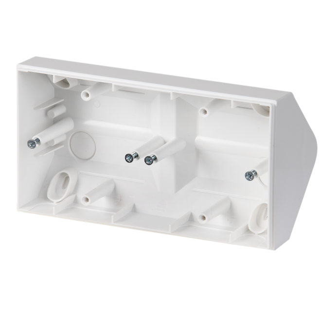 Hörnbox för ytmontage. För 2 Impressivo produkter för infällt montage. Används med 85 mm 2-facks täckram. I hörn-boxen kan man montera insatser som är 36mm djupa eller lägre