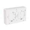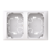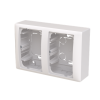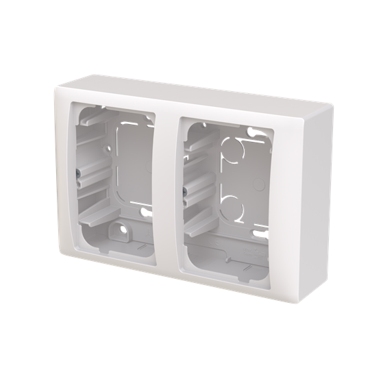 Utanpåliggande monteringsdosa SAGA 2-fack, 100 mm bred. Denna dosa är hög, med en total höjd på 48 mm. Den är lämplig för enheter med maximalt installationsdjup på 31 mm. Enheten består av bottenplatta och överdel. Biocirkulär plast används i botten- och centrumplattan.