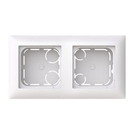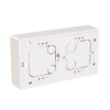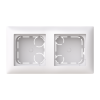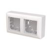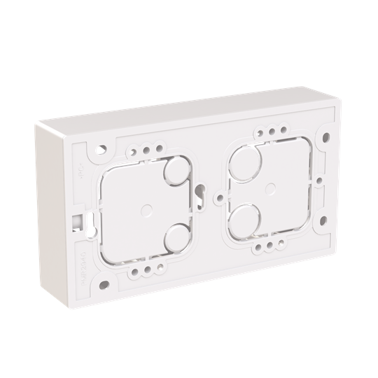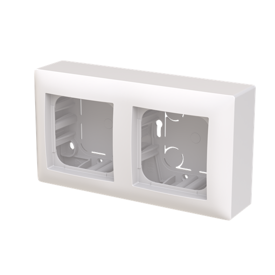 Utanpåliggande monteringsdosa SAGA för en 2-fack med 85 mm bredd. Denna låda är låg, med en total höjd på 43 mm. Den är lämplig för enheter med maximalt installationsdjup på 26 mm. Enheten består av bottenplatta och överdel. Biocirkulär plast används i botten- och centrumplattan.