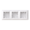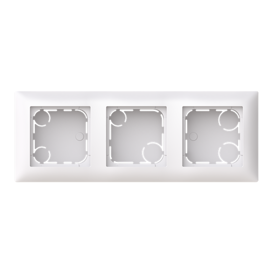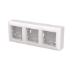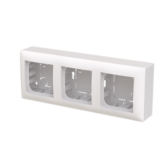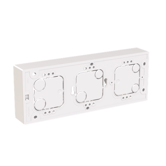 Utanpåliggande monteringsdosa 3-fack, 85 mm bred. Denna dosa är låg, med en total höjd på 43 mm. Den är lämplig för enheter med maximalt installationsdjup på 26 mm. Enheten består av bottenplatta och överdel. Biocirkulär plast används i botten- och centrumplattan.