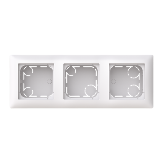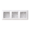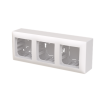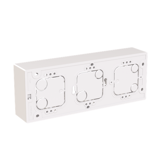 Utanpåliggande monteringsdosa SAGA 3-fack, 85 mm bred. Denna dosa är hög, med en total höjd på 53 mm. Den är lämplig för enheter med maximalt installationsdjup på 36 mm. Enheten består av bottenplatta och överdel. Biocirkulär plast används i botten- och centrumplattan.
