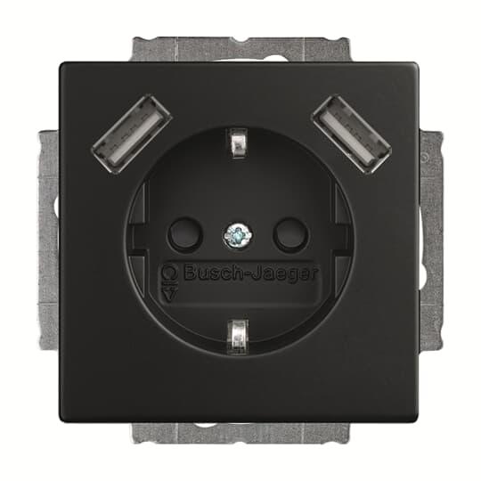 Envägs vägguttag Jordad. Med snabbanslutning. De inbyggda USB uttagen är till för laddning av mobila enheter via USB-kabel, två USB typ A-utgångar. Samtidig laddning via USB-anslutning och användning av SCHUKO®-uttaget. Stöd för laddningsprotokoll på USB-A-anslutningen: Apple MFI med 2,4 A och BC1.2 (Battery charging 1.2) med 1,5 A. Med inbyggt elektroniskt kortslutningsskydd och elektroniskt överbelastningsskydd. Med IMPRESSIVO centrumdel Matt svart. Komplettera med ram.