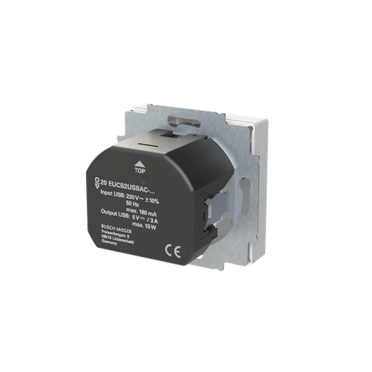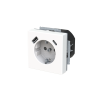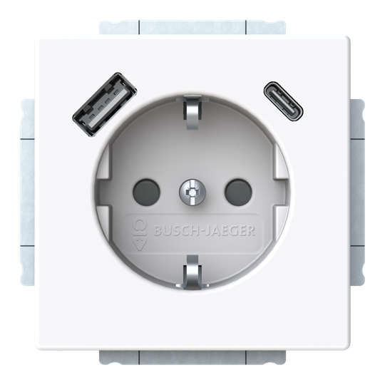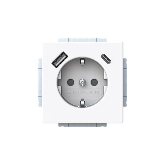 1-vägs Vägguttag, jordat med snabbanslutning. De inbyggda USB uttagen är till för laddning av mobila enheter via USB-kabel. Samtidig laddning via USB-anslutning och användning av SCHUKO®-uttaget. Stöd för laddningsprotokoll på USB-A/C-anslutningen: Apple MFI med 2,4 A och BC1.2 (Battery charging 1.2) med 1,5 A. Med inbyggt elektroniskt kortslutningsskydd och elektroniskt överbelastningsskydd.