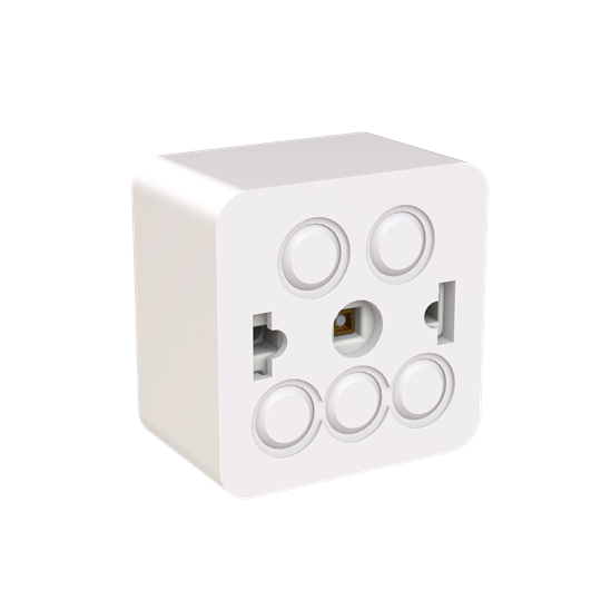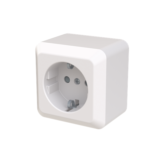 1-vägs vägguttag SAGA för utanpåliggande montering. Terminalerna är för max två stela ledningar. Biocirkulär plast används i botten- och centrumplattan.