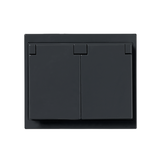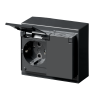 Komplett kapslat 2-vägs vägguttag IP44 med lock. Plats för 4 kablar per anslutning max 2,5 mm2. 250V/16A. Inga x-plintar.