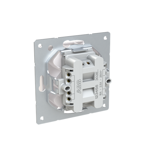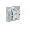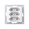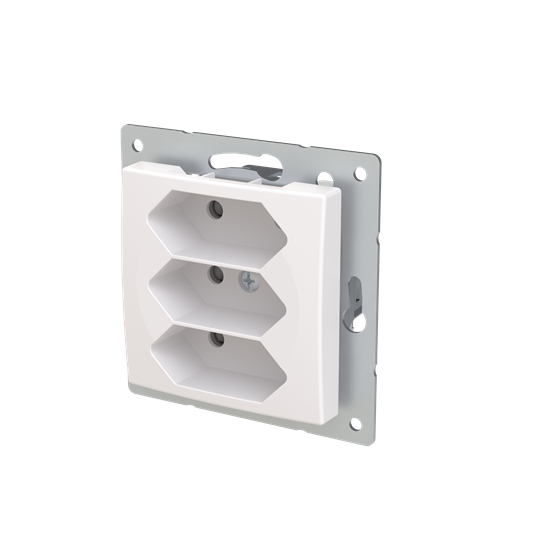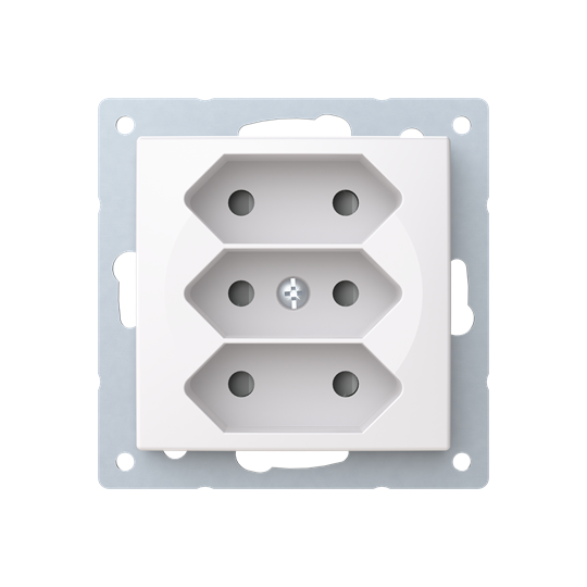 3-vägs Eurovägguttag SAGA med centrumplatta. Det finns plintar för varje kontakt i uttaget för max fyra styva ledningar samt två X-plintar för två styva ledningar. Uttagsinsatsen är petskyddad även utan lock. Biocirkulär plast används i mittplattan.