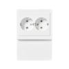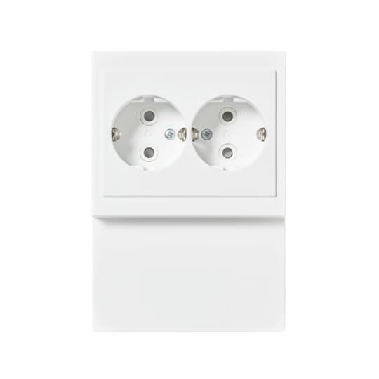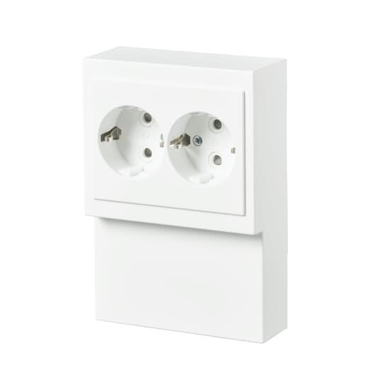 Sockeldosa med 2-vägs liggande Schuko vägguttag. 250V/16 A- Petskyddet är integrerat i insatsen. Skruvlösa anslutning, med plats för 4 styck kablar per anslutning. För EK eller FK-kabel upp till 2,5 mm2. Möjligt att låsa inkommande kablar med buntband, då det finns multipla spår att välja mellan.