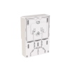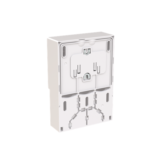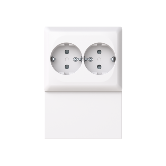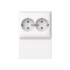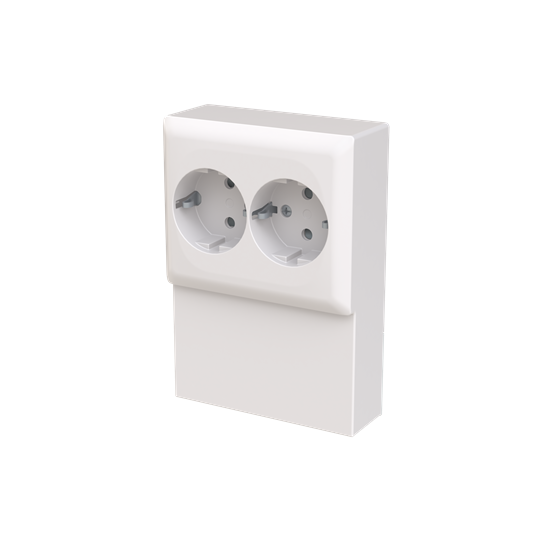 Utanpåliggande monteringsdosa SAGA med 2-vägs vägguttag. Enheten består av bottenplatta och överdel. Biocirkulär plast används i botten- och centrumplattan.