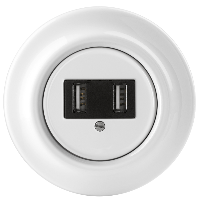 Decento, porslin, USB-A+C, komplett utan klor. Strömställarsortiment i porslin med retro design. Insatserna är moderna med skruvlösa anslutningar.