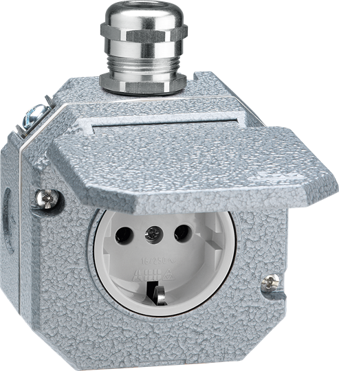 Uttagskapsling i aluminium med förmonterad PG16-förskruvning. Roterbara uttagsbrunnar och lock. Med extra jordskruv på utsidan. 3st knockout för möjlighet till vidarematning av kablage.