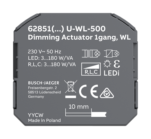 Dosmonterad dimmeraktor för Free@home eller standalone via Bluetooth. Kommunicerar trådlöst till System Access Point över 2,4 gHz nätet eller direkt via Bluetooth. 1-kanal 180W. Kräver neutralledare.