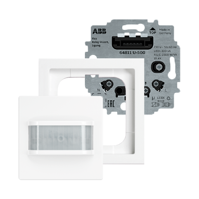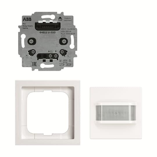 Rörelsesensor för ljusstyrning. Beroende på inställd ljusstyrka (5 - 500 lx.) känner rörelsesensorn av rörelse och tänder ljuset under den inställda tiden (10 sek. - 30 min.) efter sista rörelsen. Detta kompletta kit innehåller 64811 U-relä, 64761-84 PIR180 Basic-sensor och enkelram. Levereras i vitt Imponerande design.
