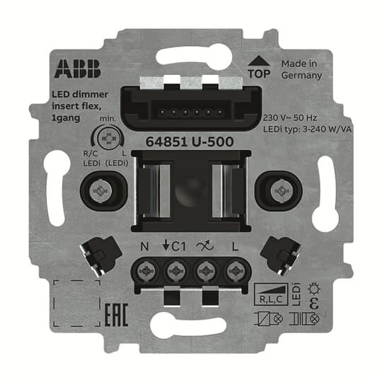 Dimmerinsats för att styra ljuset. Produkten ingår i ABB Flex-serien vilket innebär att ett antal fronter kan användas till denna produkt, allt från traditionella rörelsesensorer till switchade fronter med trådlös kommunikation till t.ex. ABB:s free@home-system. Möjligt med extern styrning via impulsbrytare. Används för belysning av belastningar från 3 - 240 W/VA beroende på belastning. Dimmerinsatsen behöver inte ansluta båda faserna, men båda faserna rekommenderas för belastningar <10 W/VA