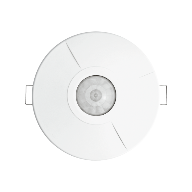 Närvarodetektor för montering inomhus, 230V, 50Hz, 2000W, IP 40 för infält montage. Övervakningsområde 360°. 10-2000 lux, frånkopplingstid ca. 5 sek. - 30 min. Monteringshöjd 2-4 m.