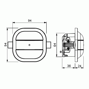 Med denna närvarodetektor kan man få Hel/Halvautomatik. 4-timmar permanentljus på /av. Korttidsimpuls för trappljus-automation. För att komma åt vissa funktioner krävs Sidoanslutningsdonet 6494-500 (13 011 43). För infällt montage. Täcker diameter 10m (3m montagehöjd). Parameterisering görs direkt på apparaten eller via handhållen IR-sändare 6843 (13 000 43)