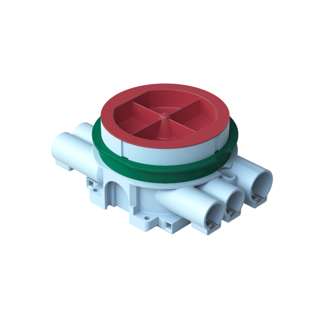 Dosan är försedd med roterande monteringsring. Skruvavståndet är cc 67 mm. Den medföljande gröna distansringen används vid enkelgips (13 mm). Ringen avlägsnas när dosan monteras i dubbelgips (26 mm). Vid montage använd dosfräs T80 84mm. Dosan är försedd med fem fasta stutsar för 16 mm rör var av en är öppnad, samt två fasta stutsar för 20 mm rör. Dessutom finns två utbrytningsöppningar på sidorna och två i botten av dosan. Tillverkad av halogenfritt material (IEC/61249-2-21) och uppfyller glödtrådsprovets krav enligt standard IEC/EN60670:2005 (850°C). Dosan går att montera i brandklassade väggar EI30/EI60. Se instruktion.