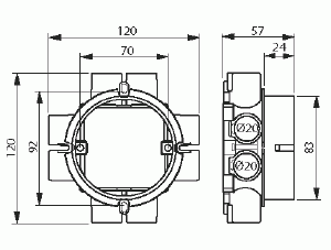 Dosan har två skruv-stolpar för M4 skruvar. Skruvavståndet är 70 mm. Den medföljande gröna distransringen används vid enkelskiva (13 mm). Ringen avlägsnas när dosan monteras i tak med dubbelskiva (26 mm). Vid montage använd dosfräs T80 84mm. Dosan har 8st fasta stutsar för 20 mm och 6st av dessa är försedda med reduceringar till 16mm. Dessutom finns två stycken utbrytningar i botten av dosan. Tillverkad av halogenfritt material (IEC/61249-2-21) och uppfyller glödtrådsprovets krav enligt standard IEC/EN60670:2005 (850°C).