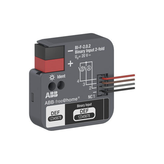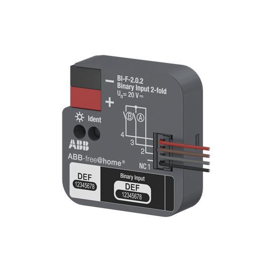 2 kanaler kan anslutas med konventionella tryckknappar eller hjälpkontakter. Informationen från kontaktavkänningen kan användas för att styra free@home-aktorer eller för att indikera statusinformation. Kontaktavkänningsspänningen tillhandahålls av binäringångsenheten. Enheterna drivs av free@home-bussen och kräver ingen ytterligare strömförsörjning. Den kompakta designen möjliggör installation i konventionella 60 mm installationsdosor eller apparatdosor.