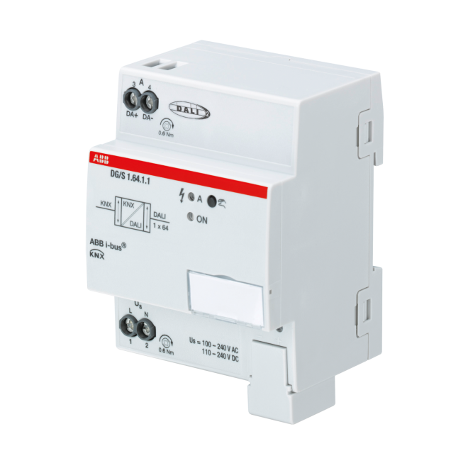 En DALI-utgång för upp till 64 DALI-don. Styr- och statusåterkoppling utförs via KNX per DALI-don (64), med belysningsgrupper (16), tillsammans i sändning eller per scener (16). Omfattande fel- och felmeddelanden finns tillgängliga. Fristående nödljuskonverterare (64) enligt EN 62386-202 stöds. Med hjälp av KNX och nödljuskonverterare kan olika nödtest (t.ex. funktion och varaktighetstest) utlösas. Feedback skickas. Slave-, trapp-, kraft-, block- och scenfunktion är integrerade. DALI-telegramfrekvens kan ändras. För diagnostisk användning och individuell ändring av DALI-adress eller grupptilldelning finns ett separat program ABB I-bus Tool tillgängligt. Följer DALI 2 standard EN 62386-202