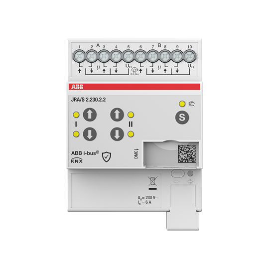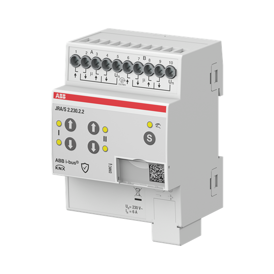 För styrning av oberoende 230 VAC-motorer via ABB i-bus® KNX. Enheterna är utformade för positionering av persienner, rulljalusier, markiser och samt för styrning av dörrar, fönster och ventilation. Någon extra hjälpspänning behövs inte. För att skydda motorn är utgångskontakterna elektromekaniskt låsta mot varandra. Tryckknappar finns på enhetens framsida för att styra utgångarna, t.ex. under körning. Utgångens aktuella status visas via lysdioder om utgången är vald."