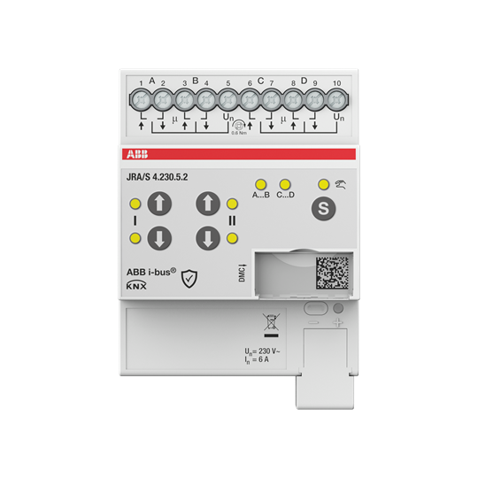 För styrning av oberoende 230 VAC-motorer via ABB i-bus® KNX. Enheterna är utformade för positionering av persienner, rulljalusier, markiser och samt för styrning av dörrar, fönster och ventilation. Någon extra hjälpspänning behövs inte. Motorns körtider detekteras automatiskt via strömavkänning. För att skydda motorn är utgångskontakterna elektromekaniskt låsta mot varandra. Tryckknappar finns på enhetens framsida för att styra utgångarna, t.ex. under driftsättning. Utgångens aktuella status visas via lysdioder om utgången är vald.