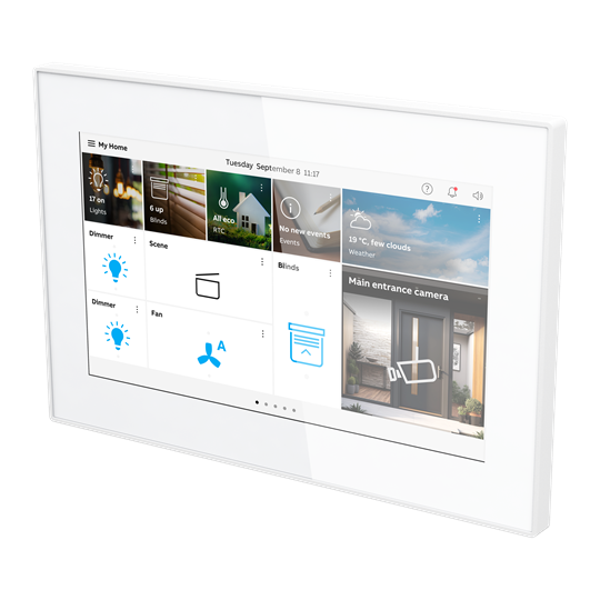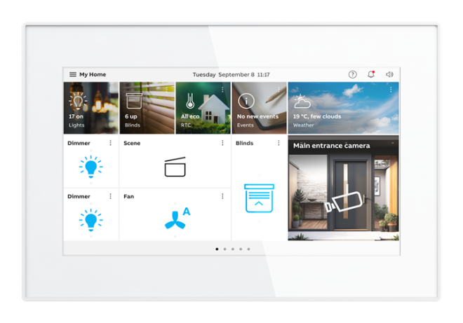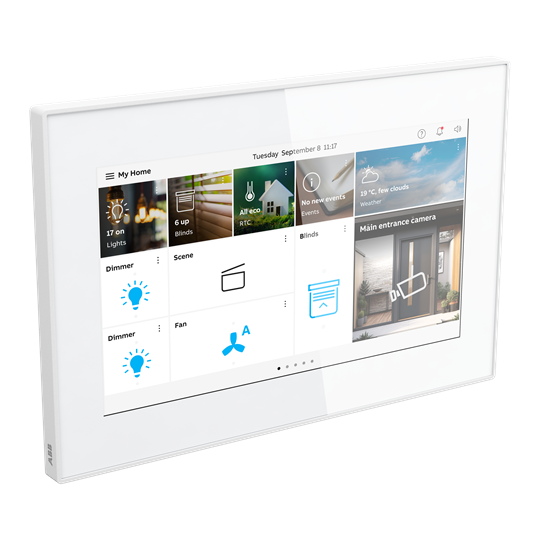 Central kontrollpanel för ABB-Welcome® (2-Wire) och ABB-free@home Styr, övervaka och hantera hela ditt system med en enhet: omkoppling, dimning, skjutreglage, persienner, RGBW-kontroll, stegomkopplare, scenomkopplare, display element och ljudkontroll.
