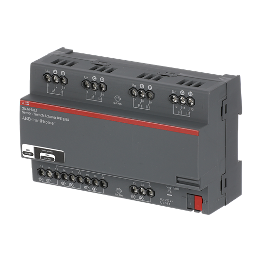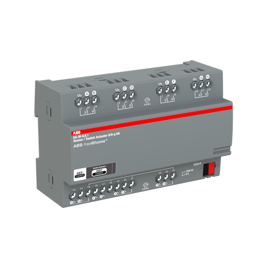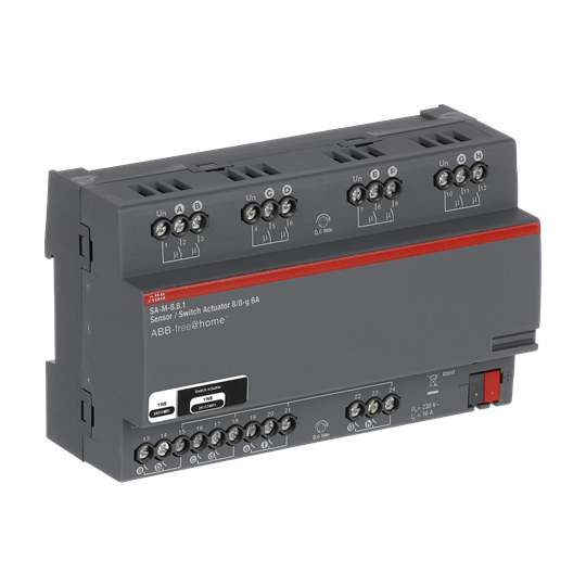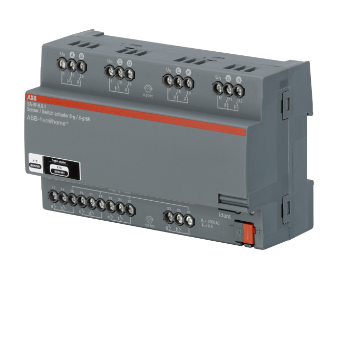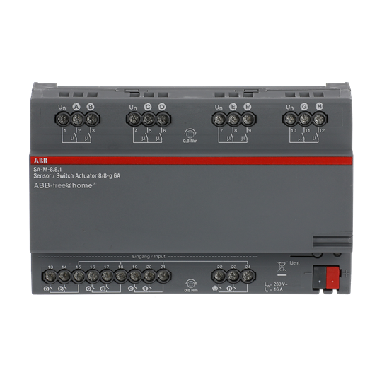 I/O aktor med 8 binäringångar och 8 brytkanaler på 6A. Med kontaktskanning. 8 DIN-moduler.