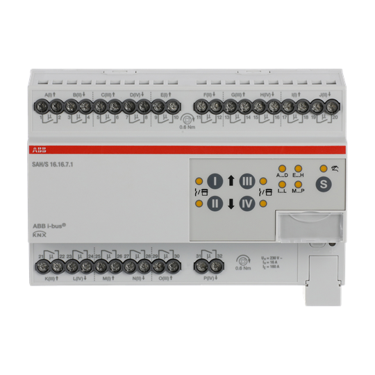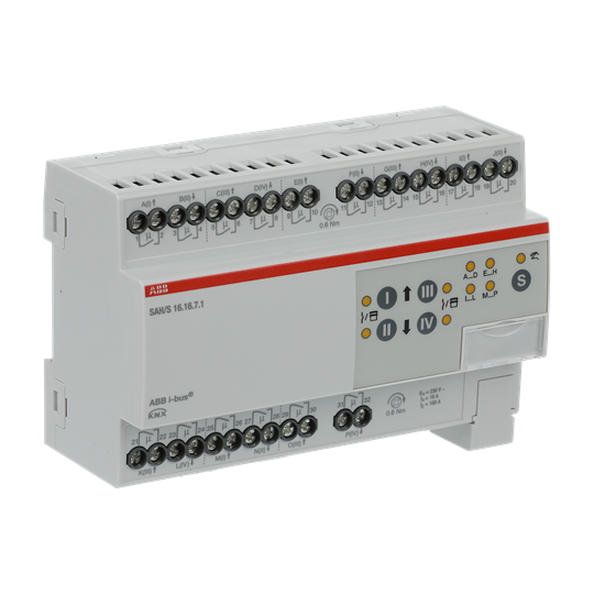 Den kompakta 16A kombiaktorn har 16 oberoende utgångar (ej elektromekaniskt sammankopplade). Utgångarna kan användas individuellt via ABB i-bus® KNX för omkoppling av elektriska laster eller parvis för styrning av 230 V AC jalusier eller markiser. Enheten har en manuell styrning, som också kan inaktiveras. Via manuell manövrering kan utgångarna manuellt köras och växlings- eller körstatus visas. Enheten drivs av busspänning och kräver ingen extra strömförsörjning. Omfattande programmerbara funktioner.