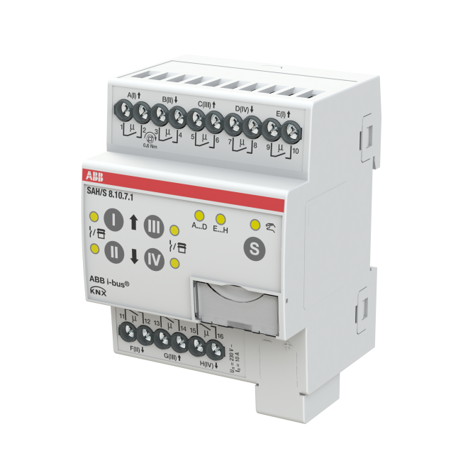 Den kompakta 10A kombiaktorn har 8 oberoende utgångar (ej elektromekaniskt sammankopplade). Utgångarna kan användas individuellt via ABB i-bus® KNX för omkoppling av elektriska laster eller parvis för styrning av 230 V AC jalusier eller markiser. Enheten har en manuell styrning, som också kan inaktiveras. Via manuell manövrering kan utgångarna manuellt köras och växlings- eller körstatus visas. Enheten drivs av busspänning och kräver ingen extra strömförsörjning. Omfattande programmerbara funktioner.