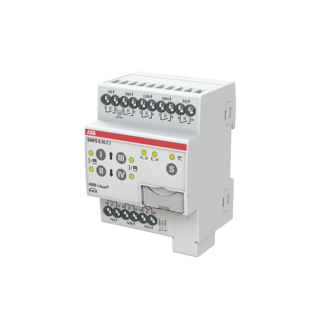 Den kompakta 16A kombiaktorn har 8 oberoende utgångar (ej elektromekaniskt sammankopplade). Utgångarna kan användas individuellt via ABB i-bus® KNX för omkoppling av elektriska laster eller parvis för styrning av 230 V AC jalusier eller markiser. Enheten har en manuell styrning, som också kan inaktiveras. Via manuell manövrering kan utgångarna manuellt köras och växlings- eller körstatus visas. Enheten drivs av busspänning och kräver ingen extra strömförsörjning. Omfattande programmerbara funktioner.