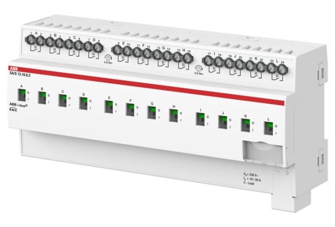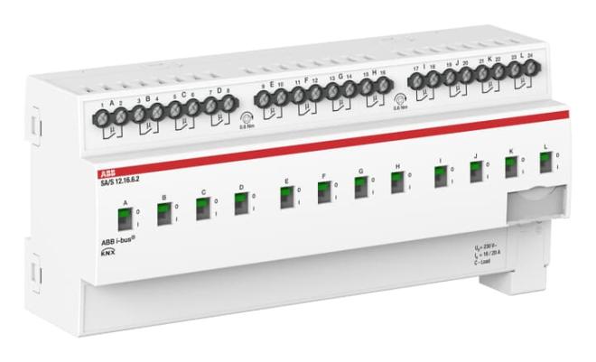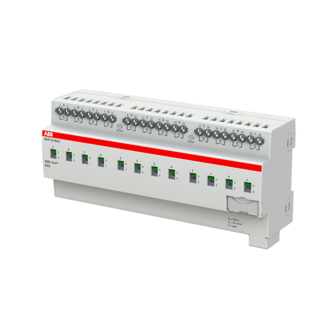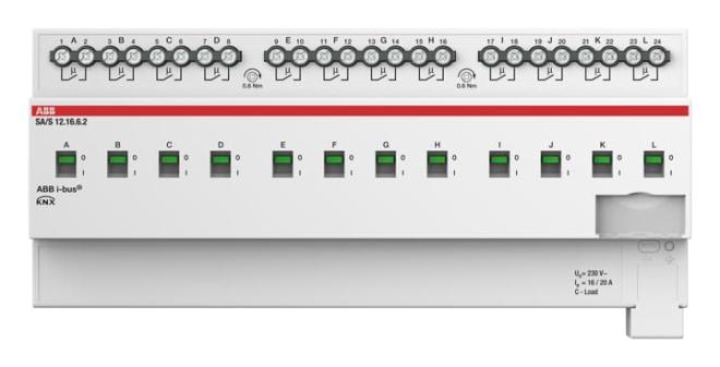 Aktorn använder potentiella fria kontakter för att växla 12 oberoende elektriska belastningar via ABB i-bus® KNX. Varje utgång har en oberoende belastningsdetektering. Enheten har en manuell manövrering och visning av kopplingstillståndet för utgångarna. 16A AC3 (C-last) är särskilt lämpad för belastningar med höga startströmmar, t.ex. lysrörbelysning (AX) enligt EN 60669. Omfattande programmerbara funktioner.