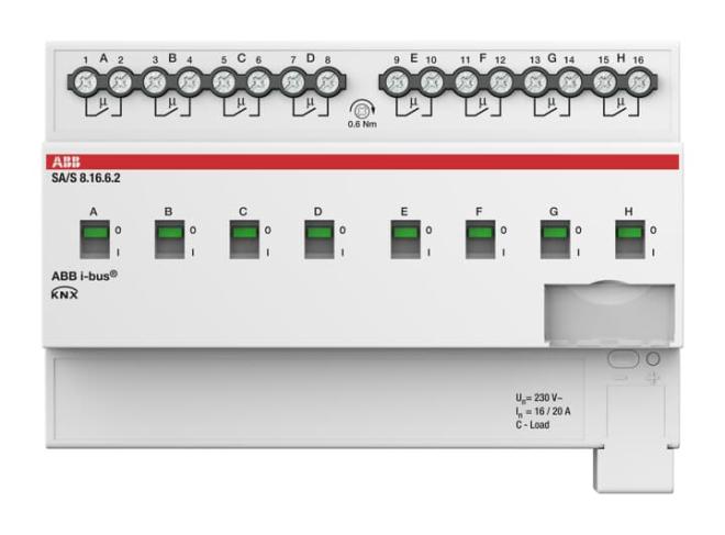 Aktorn använder potentiella fria kontakter för att växla 8 oberoende elektriska belastningar via ABB i-bus® KNX. Varje utgång har en oberoende belastningsdetektering. Enheten har en manuell manövrering och visning av kopplingstillståndet för utgångarna. 16A AC3 (C-last) är särskilt lämpad för belastningar med höga startströmmar, t.ex. lysrörbelysning (AX) enligt EN 60669. Omfattande programmerbara funktioner.