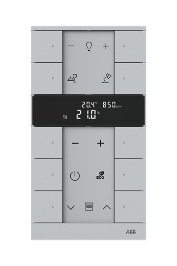 Styrelement med rumstemperaturregleringsfunktion och CO2/VOC/fuktighetssensor. För styrning av kommersiellt tillgängliga ställdon i kombination med free@home Värme-/Fläktkonvektor-aktorer. Med visning av inställt värde och aktuell temperatur. För överföring av växlings-, tryckknapps-, dimmer- och persiennkommandon till en ABB-free@home®-aktor. Med integrerad busskopplare. Med märkningsfält. Antal bussabonnenter: 2