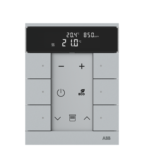 Styrelement med rumstemperaturregleringsfunktion och CO2/VOC/fuktighetssensor. För styrning av kommersiellt tillgängliga ställdon i kombination med free@home Värme-/Fläktkonvektor-aktorer. Med visning av inställt värde och aktuell temperatur. För överföring av växlings-, tryckknapps-, dimmer- och persiennkommandon till en ABB-free@home®-aktor. Med integrerad busskopplare. Med märkningsfält. Antal bussabonnenter: 2