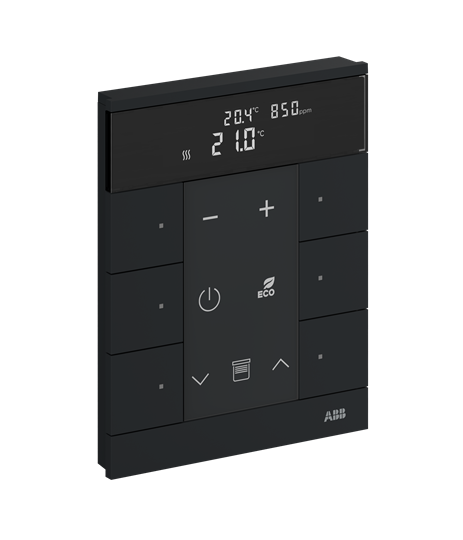 Styrelement med rumstemperaturregleringsfunktion och CO2/VOC/fuktighetssensor. För styrning av kommersiellt tillgängliga ställdon i kombination med free@home Värme-/Fläktkonvektor-aktorer. Med visning av inställt värde och aktuell temperatur. För överföring av växlings-, tryckknapps-, dimmer- och persiennkommandon till en ABB-free@home®-aktor. Med integrerad busskopplare. Med märkningsfält. Antal bussabonnenter: 2