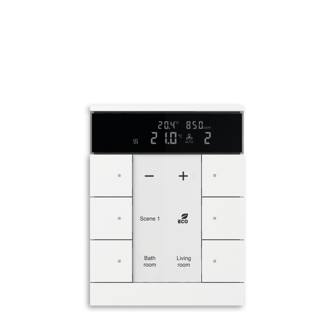 Fritt konfigurerbara multifunktions kontrollelement med RTC, CO2 samt luftfuktighetsgivare. Integrerad KNX-buss kopplare. Med märknings fält. Stöd för KNX-funktioner genom innovativt färg koncept (gult = belysning, blått = blind, orange = RTC, magenta = scen och vit = neutral/ingen funktion tilldelad) eller standardbelysning röd/grön.