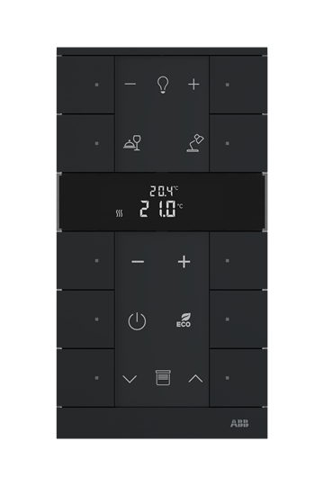 Styrelement med rumstemperaturregleringsfunktion. För styrning av kommersiellt tillgängliga ställdon i kombination med free@home Värme-/Fläktkonvektor-aktorer. Med visning av inställt värde och aktuell temperatur. För överföring av växlings-, tryckknapps-, dimmer- och persiennkommandon till en ABB-free@home®-aktor. Med integrerad busskopplare. Med märkningsfält. Antal bussabonnenter: 1