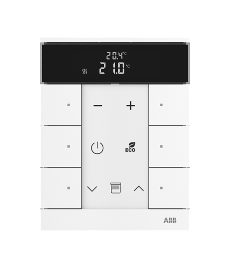 Styrelement med rumstemperaturregleringsfunktion. För styrning av kommersiellt tillgängliga ställdon i kombination med free@home Värme-/Fläktkonvektor-aktorer. Med visning av inställt värde och aktuell temperatur. För överföring av växlings-, tryckknapps-, dimmer- och persiennkommandon till en ABB-free@home®-aktor. Med integrerad busskopplare. Med märkningsfält. Antal bussabonnenter: 1