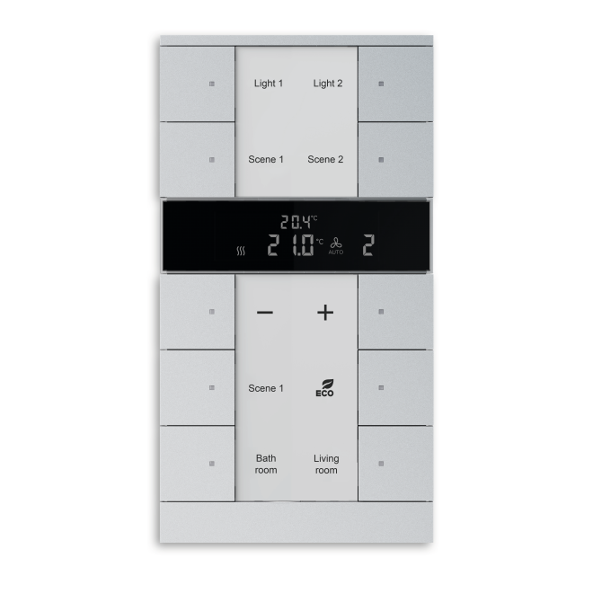 Fritt konfigurerbara multifunktions kontrollelement med RTC. Integrerad KNX-buss kopplare. Med märknings fält. Stöd för KNX-funktioner genom innovativt färg koncept (gult = belysning, blått = blind, orange = RTC, magenta = scen och vit = neutral/ingen funktion tilldelad) eller standardbelysning röd/grön.