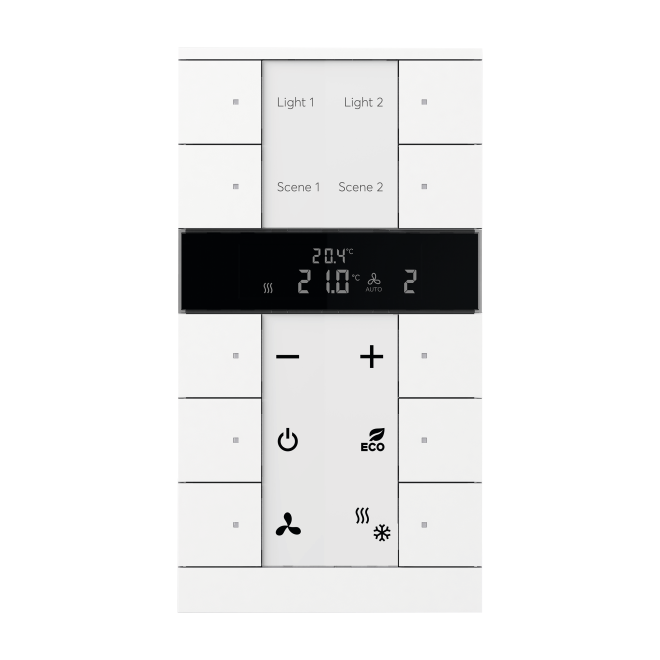 Fritt konfigurerbara multifunktions kontrollelement med RTC. Integrerad KNX-buss kopplare. Med märknings fält. Stöd för KNX-funktioner genom innovativt färg koncept (gult = belysning, blått = blind, orange = RTC, magenta = scen och vit = neutral/ingen funktion tilldelad) eller standardbelysning röd/grön.